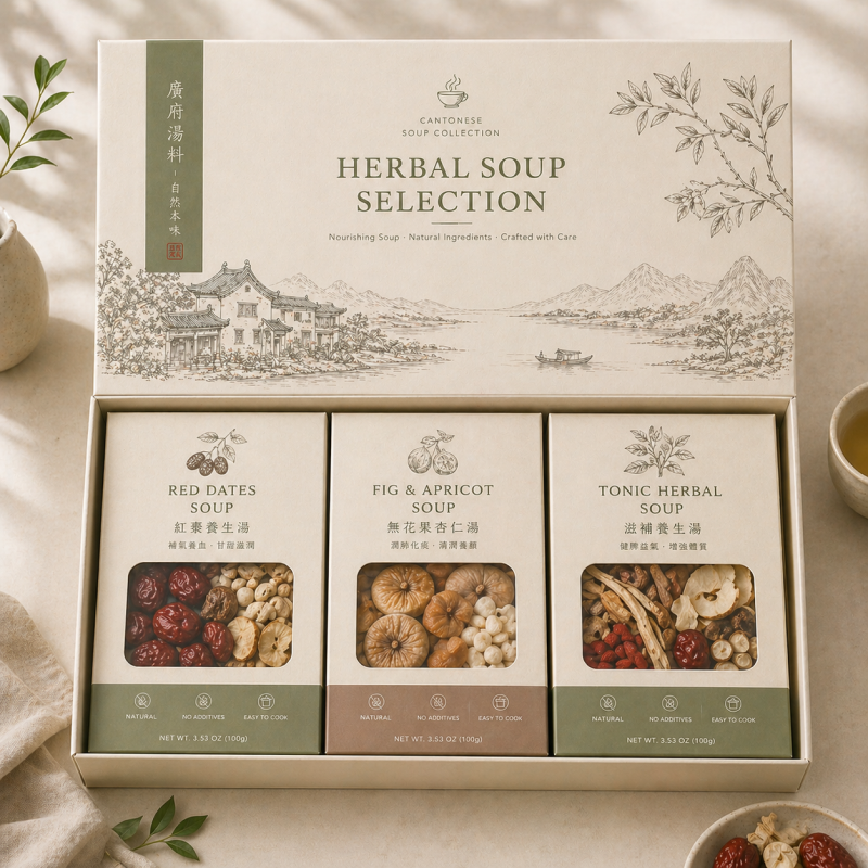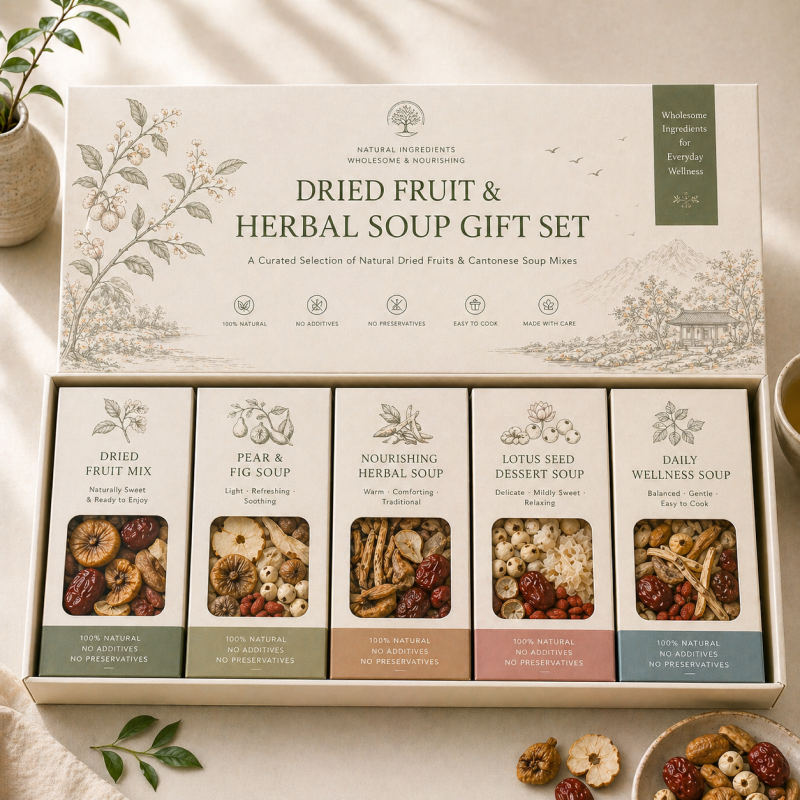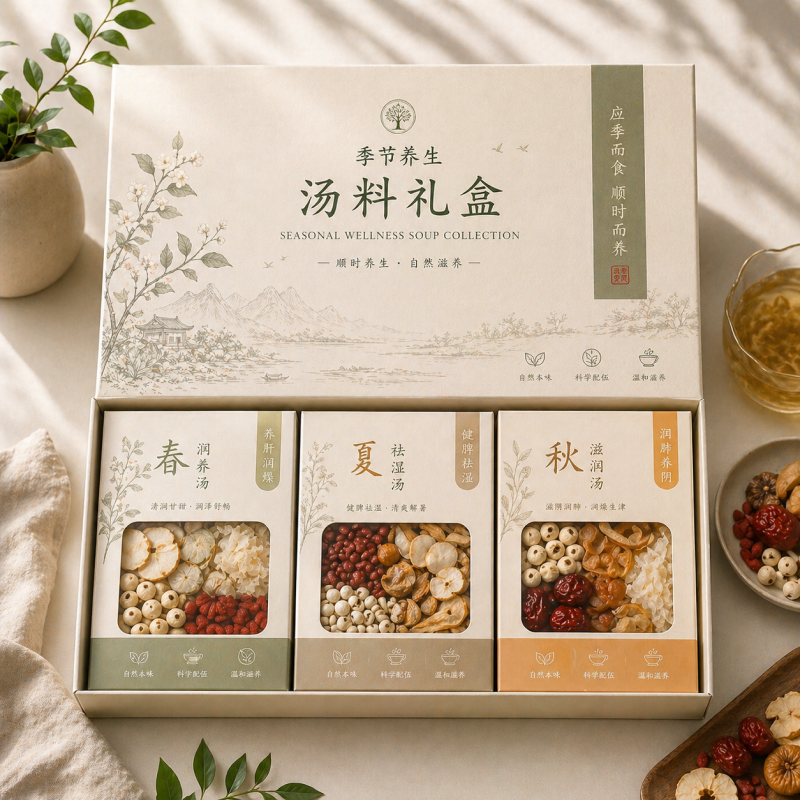 适合节日陈列和家庭送礼的五包装季节汤料礼盒。